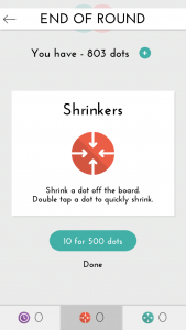 Chaque point gagné vous permettra de débloquer des »pouvoirs » vous permettant de faire encore plus de points et ainsi de suite… Vous l’avez compris, n’espérez pas faire de gros scores dans les premières parties. Trois pouvoirs sont disponibles comme la possibilité de stopper le chrono pendant une minute (un seul par partie) ou bien de supprimer un point précis vous empêchant un joli coup par exemple.