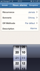 Pour le reste, c’est du classique, réglez votre alarme: récurrence, sonnerie (les sonneries offertes sont d’une horreur à vous mettre de mauvaise humeur pour la journée mais vous pousse à vous levez, c’est inévitable mais, il y a la possibilité de mettre un de vos titres de la bibliothèque musicale), la méthode d’éteinte ainsi que sa description (le nom).