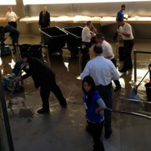 Pourtant, la boutique s’est retrouvée mal en point avec de l’eau pour une bonne partie de l’enceinte commerciale. D’après le personnel, c’est suite à des travaux au niveau du toit effectués l’année passée, que les fuites sont apparues. Les violentes pluies new-yorkaises n’ont pas arrangé le tout, ce qui a poussé les employés à bâcher les produits pommés.