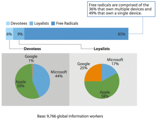 – Les dévots, eux, possèdent des terminaux d’une seule marque (6% seulement). Ils sont 56% conquis par Apple contre 44% par Microsoft.