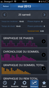 Comme vous l’aurez compris, l’originalité de cette application réside dans le fait qu’elle peut analyser votre sommeil et vous le détailler via des tableaux clairs et concis. Le nombre de cycles (4 à 5 par nuit), le temps dans chacune des phases du sommeil, l’analyse du bruit ainsi que de vous réveiller à l’heure optimale par rapport à l’heure à laquelle vous devez vous lever grâce à l’algorithme STrack 2.0.