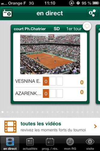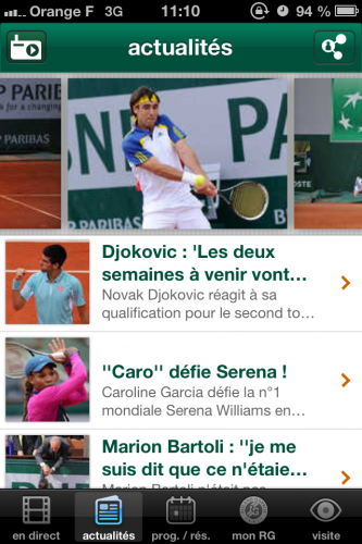 Nous l’attendions tous (ou pas) ; l’application de Roland Garros 2013 est enfin disponible. Grâce à elle nous aurons le plaisir de pouvoir suivre les différents matchs du tournoi. Cette application, pour le moins complète nous propose des vidéos, une radio dédiée, des actualités en lien avec les matchs, etc…