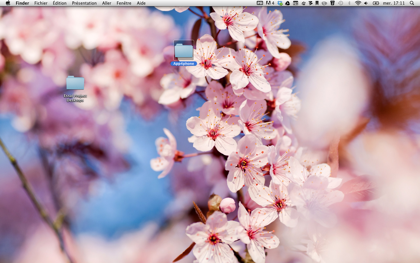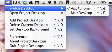 Le concept est simple: vous pouvez avoir autant de « Desktops » que vous le souhaitez. Dans mon exemple, j’ai mon bureau « principal », et un autre réservé à App4Phone. Pour switcher entre les deux, c’est facile: on clique sur l’icône de l’application, on va dans le menu « Switch Desktop » et on choisit celui que l’on veut voir apparaître. « Open Project Desktop » permet d’ouvrir le dossier où se trouvent l’ensemble de nos dossiers du bureau correspondant, et l’on retrouve également deux boutons pour ajouter ou supprimer un nouveau bureau, et un dernier pour changer le fond d’écran (qui changera automatiquement avec le bureau).