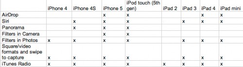 Tableau récapitulatif de la compatibilité des fonctionnalités iOS 7 avec les différents appareils pommés :