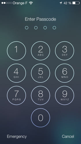 Enfin, pour déverrouiller votre iDevice, le slide vers la droite a été conservé mais la barre a disparu. C’est un peu déconcertant et j’avoue que j’ai eu quelques hésitations quant à la manière de déverrouiller mon téléphone. Le fond d’écran glisse avec votre doigt et laisse place au springboard ou au code de verrouillage. Ce dernier a bien changé comme vous pouvez le voir sur la photo.