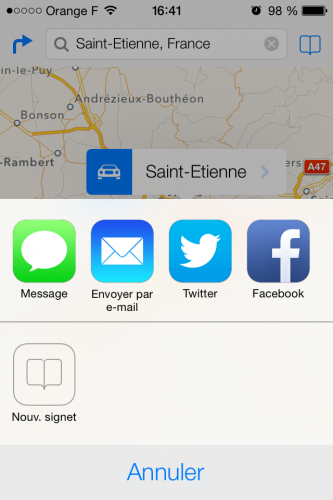 Apple a également souhaité simplifier le partage (comme nous avons pu aussi le remarquer sur les autres applications). En un clic vous pourrez partager votre position par Message, e-Mails, Facebook ou Twitter.