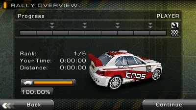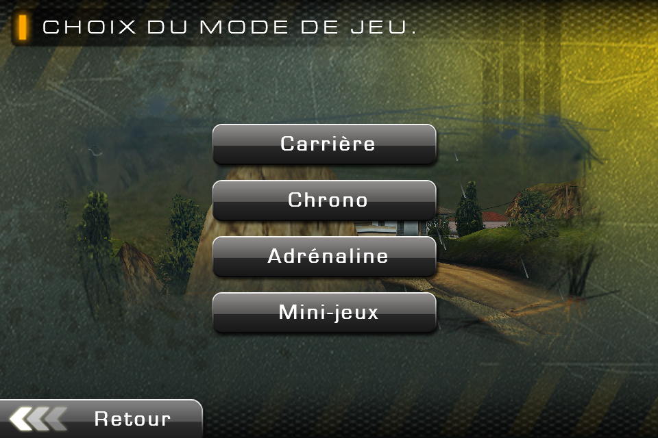 Rally Master nous fait prendre le contrôle d’un bolide de course à travers plusieurs modes de jeux. Le principal et le plus long d’entre eux est le mode « Carrière », qui nous emmène à travers trois rallyes différents, c’est-à-dire trois séries de courses. Il y a 9 courses par rallye, et chacune d’entre elle fait entre 1 minute et 1mn40. Deux autres modes de jeu ne sont que des déclinaisons de ce premier mode, en ceci qu’ils proposent de rejouer les courses débloquées dans le mode Carrière en essayant de faire le meilleur temps possible (mode Chrono) ou d’essuyer le moins de dégâts possible (mode Adrénaline). Le dernier mode, enfin, est constitué de mini-jeux auxquels on peut jouer dans le mode Carrière pour réparer sa voiture, et est accessoire (les 3 mini-jeux proposés ne sont pas très passionnants)