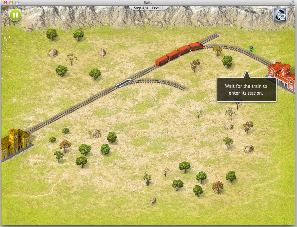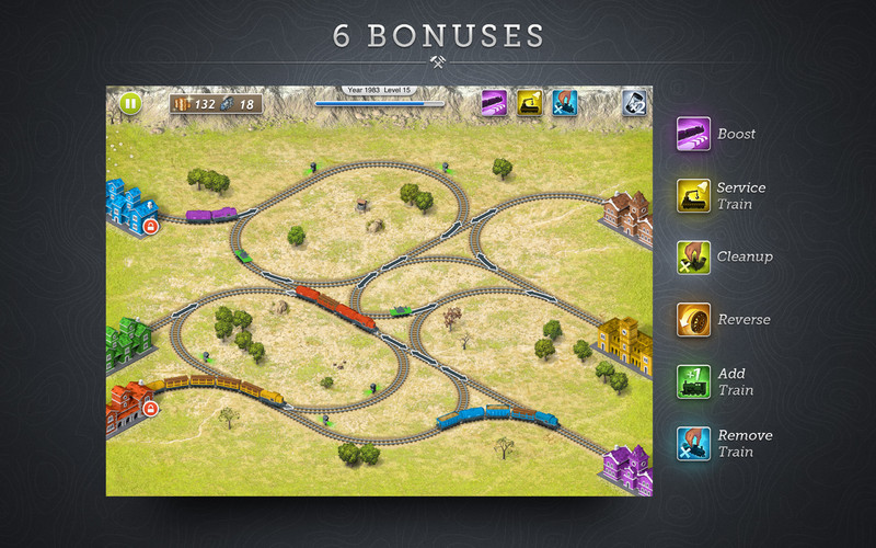 S’il est dommage que l’éditeur n’ait pas pris le temps de développer une version plein écran réellement destinée aux Mac, le jeu n’en demeure pas moins intéressant, notamment de par sa difficulté. Au premier abord, on pourrait croire que le jeu est très simple mais il n’en est rien: votre train ne peut emprunter que des chemins courbes (n’imaginez pas qu’il puisse tourner à l’angle droit), les trains commencent au fur et à mesure à sortir tous en même temps des gares, et cela devient vite un véritable casse-tête pour éviter toutes les collisions. Sans compter les nombreux bonus disponibles à utiliser avec la plus grande réflexion: vous pourrez en effet accélérer la vitesse de vos trains, mettre en place un train qui ramasse les déchets encombrant les rails, déblayer manuellement le passage, renvoyer un train vers l’arrière, ajouter un nouveau train ou en supprimer un.