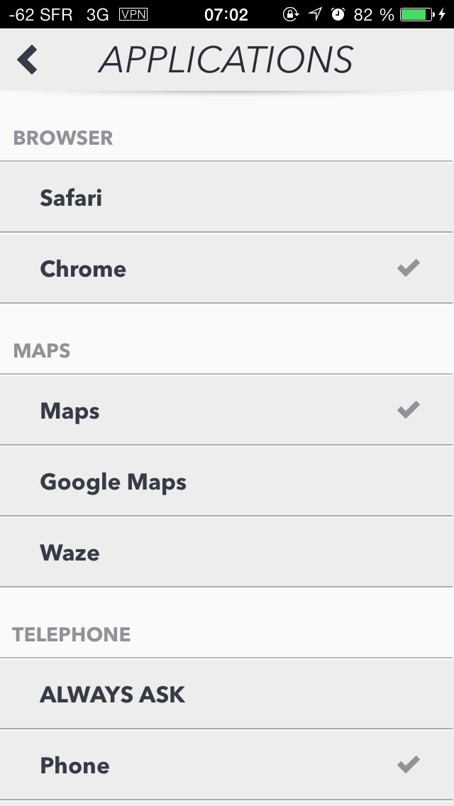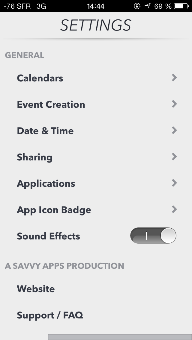 Petit point bonus : Les réglages ne permettent pas de modifier énormément de choses, mais on peut tout de même cocher quels calendriers (Professionnel, anniversaires…) afficher, et surtout, surtout, choisir entre différentes applications externes celles que l’on veut utiliser. Par exemple, si je met un lien en commentaire d’un événement, je peux faire en sorte que ce soit Chrome et non Safari qui s’ouvre !