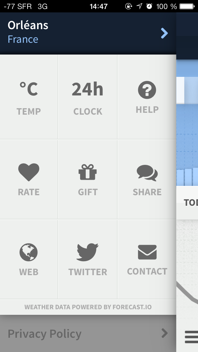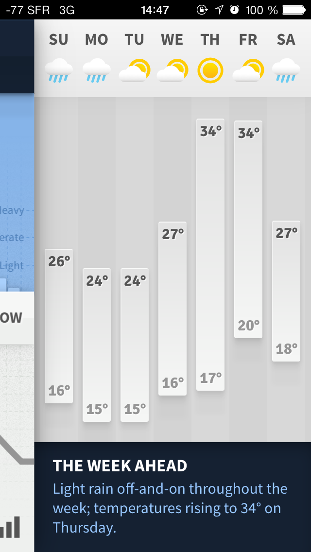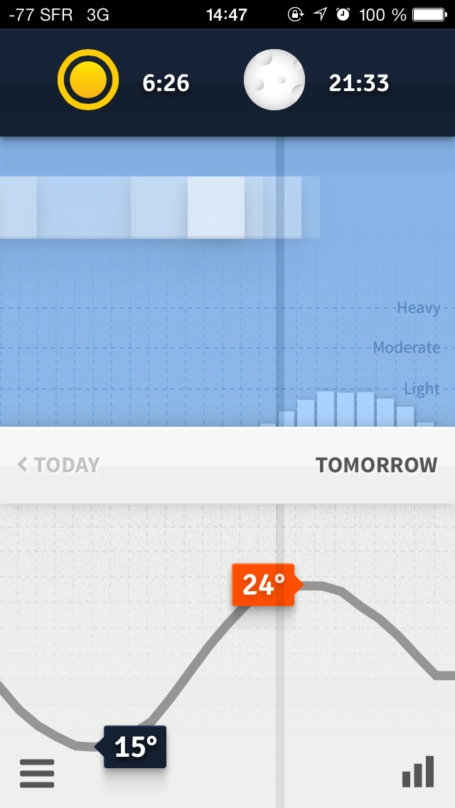 Je tire mon chapeau pour cette application ! Elle réussit à faire tenir toutes les informations nécessaires pour connaître la météo en un seul écran, qui reste très clair et dégage une impression d’espace : Rien n’est compacté, illisible ou relégué dans un coin sombre de l’Iphone, il suffit d’un coup d’œil pour s’en rendre compte et le plaisir est au rendez vous. Les icônes telles que les nuages, le soleil ou la pluie sont épurées au maximum, rien n’est écrit petit, et l’ensemble dégage une impression de fluidité et de simplicité que l’on retrouve rarement ailleurs.