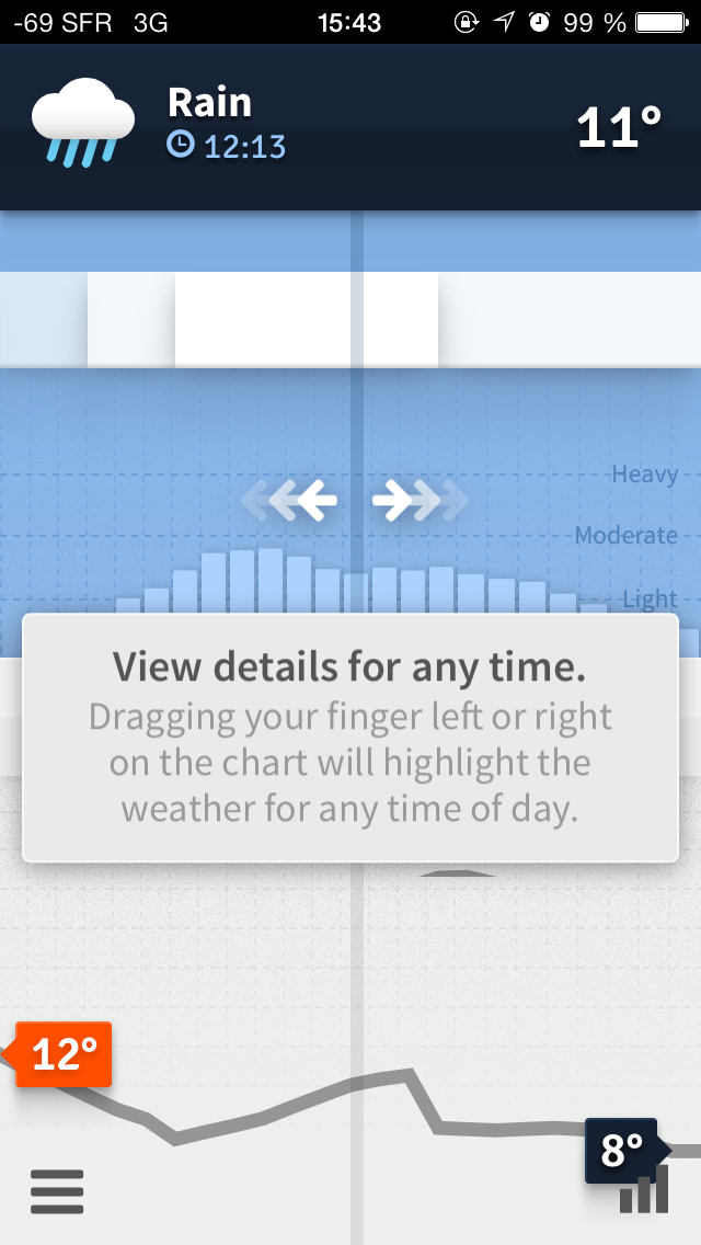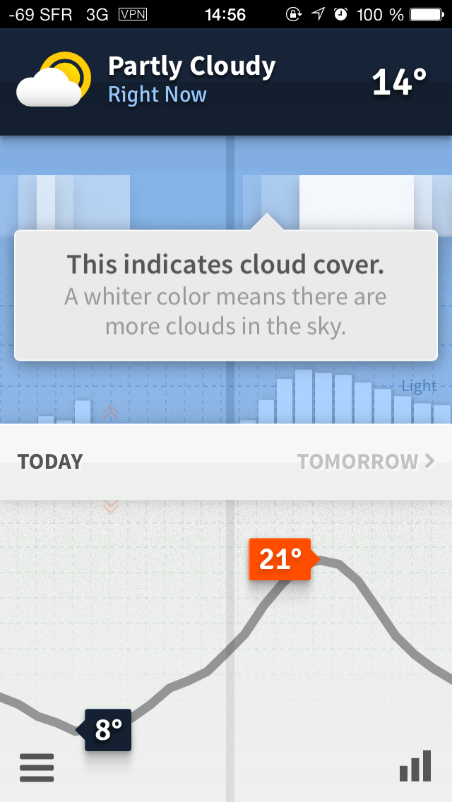 La prise en main est très rapide : tout d’abord, un tutoriel très bien fait et on ne peut plus clair nous explique ce qu’indiquent chacune des parties de l’écran. Il suffit ensuite de reproduire chacun des gestes expliqués une fois le tutoriel terminé pour avoir maîtrisé l’application, ce qui prend au total moins d’une minute ! Dans l’écran principal qui indique la météo quotidienne, on retrouve de haut en bas la couverture nuageuse ainsi que la température, suivie d’un premier graphique qui indique l’intensité de cette couverture nuageuse sur la journée entière, ainsi qu’un graphique en bâtons qui permet de se faire une estimation de la force des précipitations à un moment de la journée. La moitié inférieure de l’écran est elle consacrée à un dernier graphique qui indique, toujours sur la journée entière, la courbe des températures. Il suffit ensuite de faire glisser son doigt vers la gauche ou la droite pour savoir quelle température et quelle couverture nuageuse il y aura précisément à tel moment de la journée. Simple comme bonjour ! Toutefois, il n’est même pas utile de faire glisser son doigt, puisque toutes les données sont montrées très clairement.
