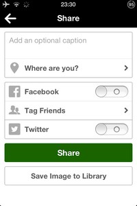 Suite à cela, vous aurez le choix de partager ou non cette photo « bi-goût ». Vous pouvez dès lors ajouter un petit commentaire et indiquer la localisation de la prise de vue. En cochant les options Facebook et Twitter, et en appuyant sur Share, votre création se retrouvera instantanément partagée. Mais il est tout à fait possible de simplement sauvegarder la photo en local, sans la partager.