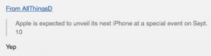 C’est Jim Dalrymple qui réaffirme l’objet du 10 septembre pour la prochaine Keynote d’Apple. Ce dernier a l’habitude de relayer des infos non officielles qui s’avèrent être souvent vraies. Pour autant, l’info n’est pas « encore » validée par Apple, on attend leur réponse avec impatience.