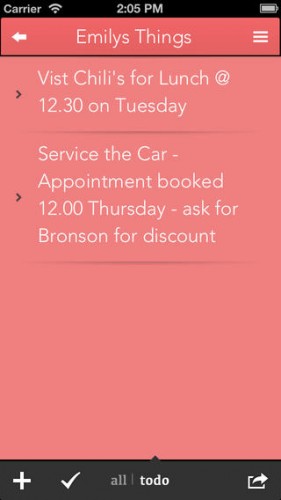 Organisez vous très simplement avec DoTo, une app au design ultra minimaliste qui fait ce qu’on lui demande. Pour ajouter une catégorie, il suffit de cliquer sur le « + » en haut à gauche de l’écran puis de la nommer, cliquez ensuite sur « suivant » en bas à droite du clavier pour ajouter une nouvelle tâche (ou sur le « + » en bas à gauche quand le clavier est fermé). Une fois une tâche effectuée, un simple clic à gauche de son intitulé la validera. Pour supprimer une catégorie ou une tâche, il suffit de la balayer et un bouton « delete » apparait (façon iOS 7). Téléchargez gratuitement DoTo.