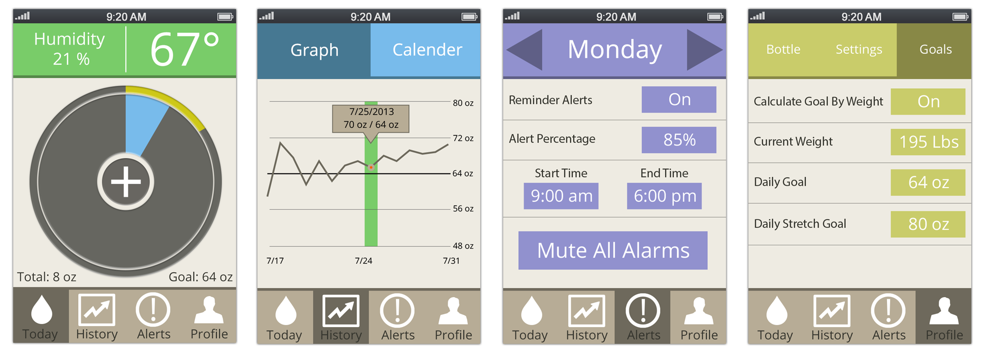 Élégante et ergonomique, cette « gourde high-tech » offre de multiples possibilités afin de suivre en temps réel votre consommation sur votre iPhone (4s et plus). Graphiques détaillés, historique, conseils, alarmes paramétrables et profil personnalisable, voilà tout ce que l’application aura à vous offrir après une synchronisation Bluetooth avec la bouteille. Une nouvelle application de Health-monitoring dans un concentré de technologie. La bouteille aura pour objectifs de récolter les informations transmises par ses capteurs (niveau, hygrométrie, température) et de vous avertir lorsque vous devez vous hydrater. Enfin, l’iPhone récoltera ces informations, l’application les analysera et déterminera exactement vos besoins.