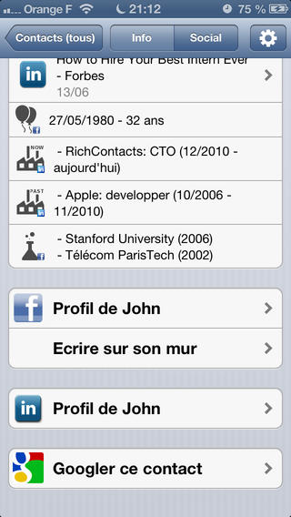 Rassemblez tous vos contacts Facebook, Twitter et Linkedin et visualisez leurs derniers statuts rapidement et simplement. Noté 4/5 pour 145 avis. Télécharger gratuitement RichContacts.
