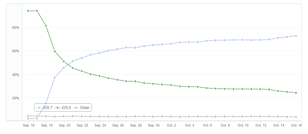 D’après le graphique ci-dessus, la progression est soutenue et linéaire depuis le gros boom lors de sa sortie. iOS 6 continue à décliner et est soutenu par les appareils non compatibles avec l’iOS 7 et les utilisateurs ne désirant pas effectuer la mise à jour pour des raisons de Jailbreak notamment. Par comparaison avec l’année dernière et sur le même laps de temps, l’iOS 6 n’avait réussi à conquérir que 60% des iDevices. La révolution attendue a visiblement conquis ou/et éveillé la curiosité des utilisateurs.