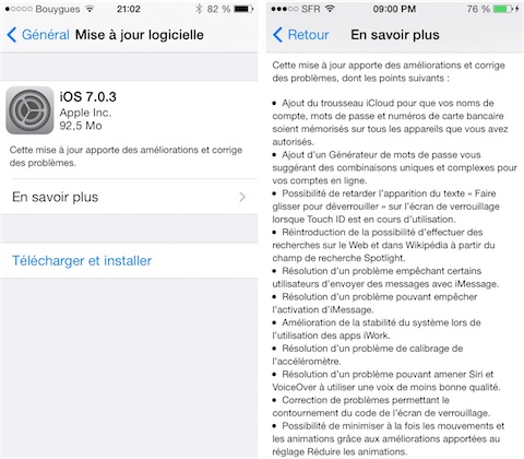 Alors que la Keynote d’Apple vient de se terminer, voici qu’une mise à jour d’iOS 7 fait son apparition : iOS 7.0.3 numéroté 11B511 qui pèse 92,5 Mo sur iPhone 5S et prendra 1,7 Go d’espace de stockage sur votre appareil. Disponible pour tous les appareils à partir de l’iPhone 4, iPad 2 ou iPod touch 5G. Une mise à jour dite mineure mais qui apporte son lot de correctifs et de nouveautés comme l’ajout d’options d’accessibilité.