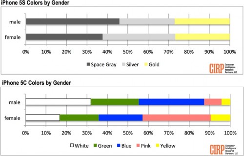 L’iPhone 5S et 5C ont apporté leurs lots de nouveautés et de coloris. L’or a rejoint le gris sidéral et l’argent pour le téléphone haut de gamme de la firme. L’iPhone 5C peut s’habiller d’une coque blanche, verte, bleue, rose ou jaune. Consumer Intelligence Research Partners (CIRP) a mené une étude sur les coloris des iPhone vendus aux Etats Unis sur 400 acheteurs pendant le premier mois de commercialisation.