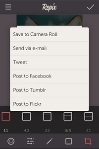 L’icône représentée par une sorte de crayon propose 8 effets de décoration applicables aisément en glissant son doigt sur l’image. Les effets sont de belle qualité mais leur nombre assez restreint. Côté cadres, 8 sont aussi disponibles dans cette version gratuite. Enfin, vous pourrez redimensionner facilement votre image à travers la cinquième icône. Lorsque vous êtes satisfait du résultat, vous pourrez valider les changements et sauvegarder votre création dans votre photothèque, ou la partager via Email, Twitter, Facebook, Tumblr ou encore Flickr.