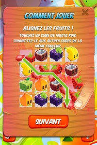 Pour éliminer les cubes, vous devrez sélectionner au minimum 3 cubes fruités de la même couleur étant les uns à côté des autres. Ceux-ci peuvent être joints verticalement, horizontalement et de manière oblique. Si vous parvenez à en éliminer plus de 3 en même temps, un cube bonus apparaîtra en lieu et place du dernier. Cela permettra notamment de pouvoir éclater une ligne complète, une colonne complète, faire exploser toute une partie du tableau…etc. Et vous pourrez aussi combiner ces cubes spéciaux pour des effets encore plus ravageurs !