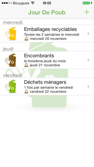 Dans « Jour De Poub », vous paramétrez vos différents jours de collectes et c’est l’application qui vous prévient quand vous devez les sortir. Noté 4/5 pour 94 avis. Télécharger gratuitement Jour De Poub.
