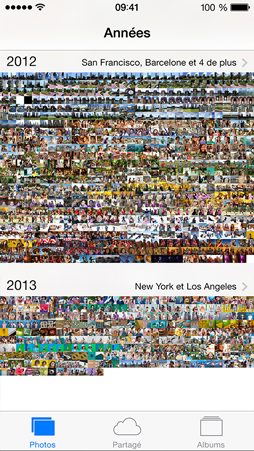 A l’ouverture de l’album photo, on a le choix entre plusieurs types d’affichages : “Albums”, “Photos” et « Partagé ». C’est en cliquant sur “Photos” que l’on obtiendra la vue intelligente. Un simple clic sur “Collections” en haut à gauche vous donne déjà accès à des groupes de photos plus larges classés par dates. Si on clique ensuite sur “Années” toujours en haut à gauche, on obtient une vue d’ensemble encore plus étendue des images, classées par années cette fois-ci. Très pratique si on prend beaucoup de photos.