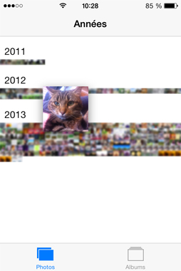 Voici la vignette d’aperçu qui s’affiche tant qu’on ne décolle pas le doigt de l’écran. Relâchez votre doigt sur une photo pour l’ouvrir ou dans le fond blanc pour rester dans la vue par années.