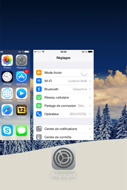 Tout d’abord, il vous faudra ouvrir le multi-tâches en effectuant un double-clic sur le bouton home, et fermer toutes les applications ouvertes. Ensuite, de retour sur l’écran d’accueil, ouvrez les réglages puis sans rien toucher retournez sur l’écran d’accueil, enfin double-cliquez sur le bouton home. Vous devriez avoir ceci à l’écran :