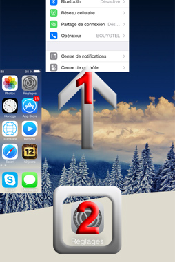 Et c’est ici que la manipulation doit se faire, pour ma part je n’ai pas réussi du premier coup, donc pas de panique si ça ne fonctionne pas directement, il vous faudra trouver le bon timing. Je m’explique. Le geste consiste à fermer l’app réglages avec un cliqué-glissé vers le haut, puis tout de suite après, de cliquer sur l’icône des réglages en bas de l’écran. Voici une représentation schématique du mouvement à effectuer :