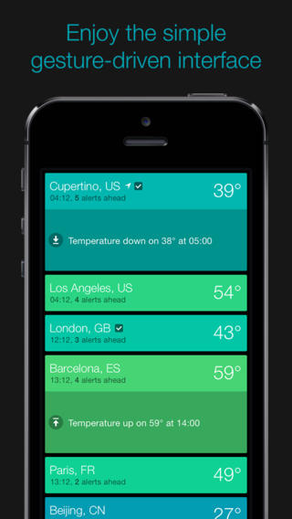 Pour finir la sélection de la journée, une appli météo intelligente. Interface avec l’utilisateur bien pensée, alertes nombreuses disponibles : vitesse vent, précipitations, température mini/maxi, lever/coucher du soleil, prévisions horaires par journée, paramètres pour les notifications, … Compatible iPhone, iPod. Télécharger Alertic – Smart Weather App à 0,89€.